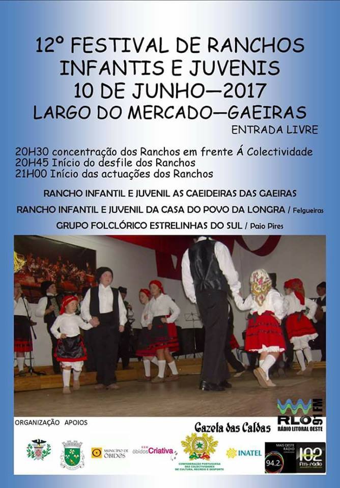 A vila das Gaeiras acolhe, no próximo sábado, dia 10 de Junho, o 12.º Festival de Ranchos Folclóricos Infantis e Juvenis. Uma organização da Sociedade Musical e Recreativa Gaeirense (S.F.R.G.).
