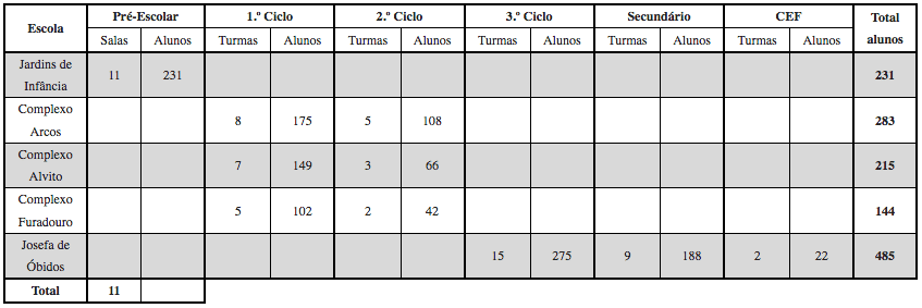 O Ano Letivo 2020/2021, no concelho de Óbidos, inicia-se no próximo dia 17 de Setembro, quinta-feira, para todos os alunos dos jardins-de-infância, 1º, 2º e 3º Ciclos do Ensino Básico e Ensino Secundário e Cursos de Educação e Formação (CEF). Ao todo, são este ano 1358 alunos divididos por 67 turmas.