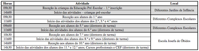 Calendarização das atividades de início do ano letivo, dia 17 de Setembro