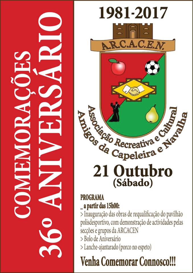 A ARCACEN – Associação Recreativa e Cultural Amigos da Capeleira e Navalha assinala, no próximo dia 21 de Outubro, o seu 36º Aniversário.