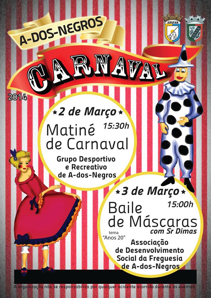 A celebração desta época carnavalesca, da ADSFAN, começa no domingo, dia 2, com uma matiné, com início às 15h30, a decorrer no salão do Grupo Desportivo e Recreativo de A-dos-Negros.