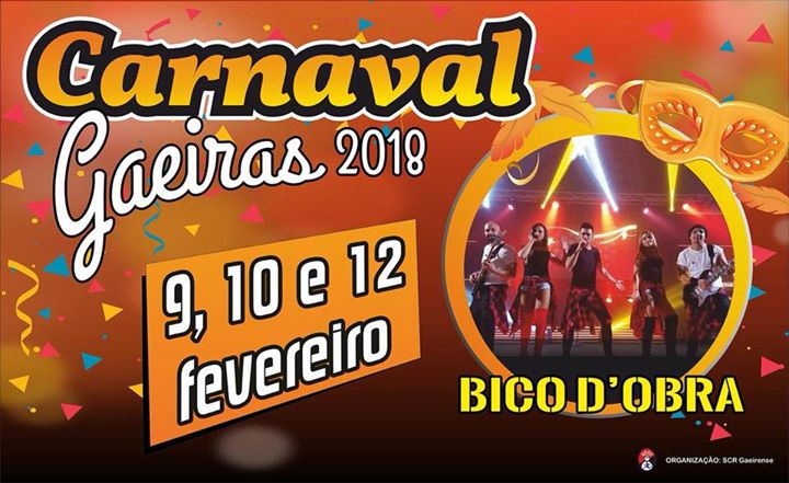 O Carnaval nas Gaeiras está de volta, com bailes, nos dias 9, 10 e 12 de Fevereiro, animado pela banda “Bico D´Obra”. A festa decorrerá no Pavilhão da Sociedade Cultural e Recreativa Gaeirense (SCRG).
