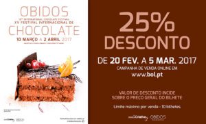 Começou hoje, dia 20 de fevereiro, uma campanha de descontos para a compra antecipada de entradas para o evento Festival Internacional de Chocolate de Óbidos. Até dia 5 de março, os bilhetes têm um desconto de 25 por cento.