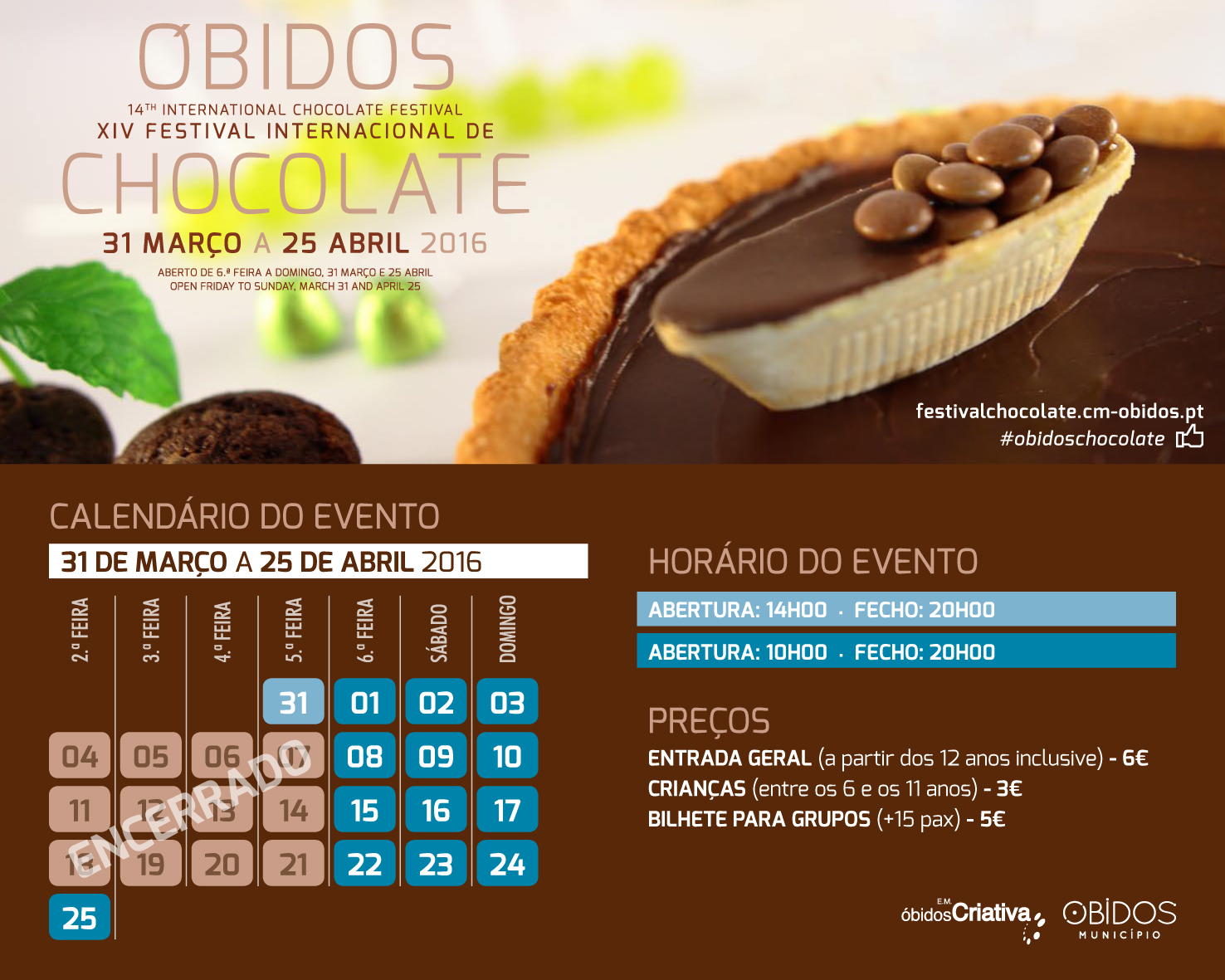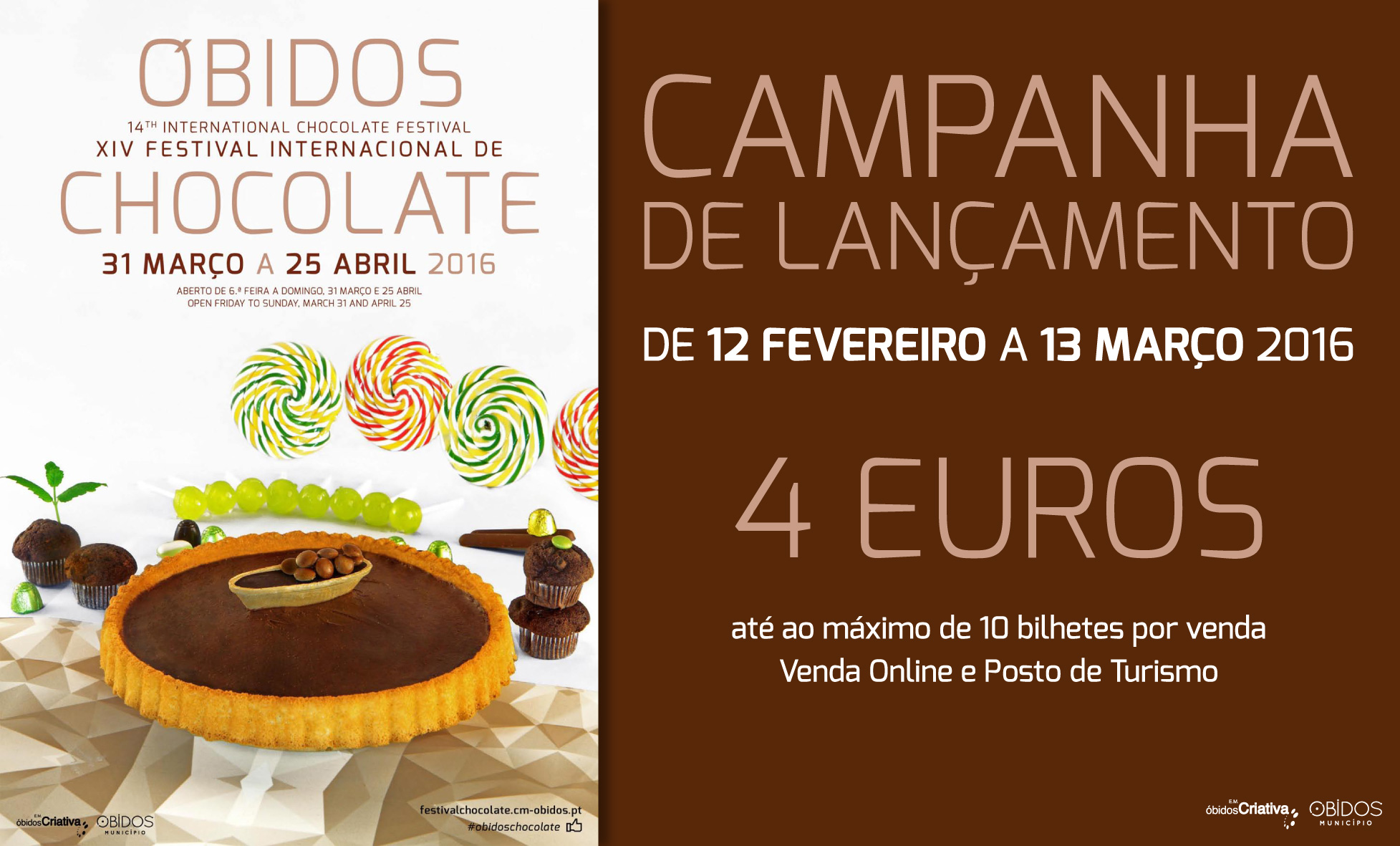 Começa, dia 12 de fevereiro, uma campanha de descontos para a compra antecipada de entradas para o evento Festival Internacional de Chocolate de Óbidos, que, este ano, decorre de 31 de março a 25 de abril, aberto de sexta a domingo. A campanha decorre até dia 13 de março.