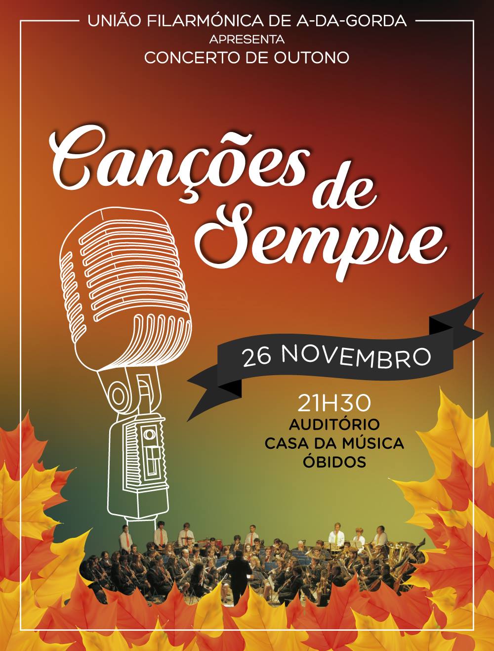 A União Filarmónica de A-da-Gorda (UFA) apresenta mais uma edição do Concerto de Outono – Canções de Sempre, que decorrerá no próximo dia 26 de novembro, a partir das 21h30, no Auditório Municipal Casa da Música, Óbidos.