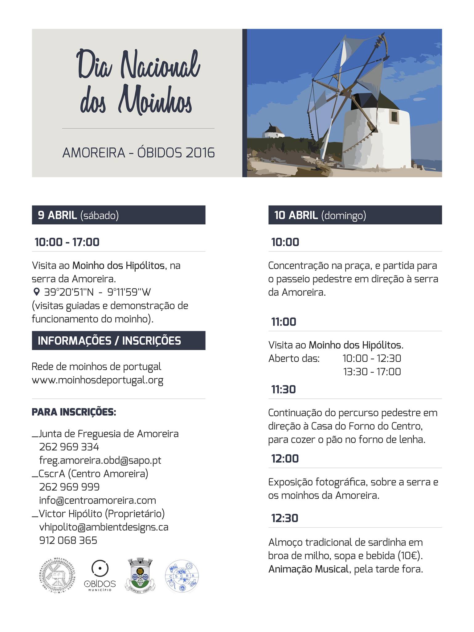 O Centro Social da Amoreira organiza, primeira vez naquela freguesia do concelho de Óbidos, o Dia Nacional dos Moinhos. A iniciativa acontece dias 9 e 10 de abril, com várias iniciativas. A nível nacional, haverá mais de 300 moinhos inscritos, segundo a Rede de Moinhos de Portugal.