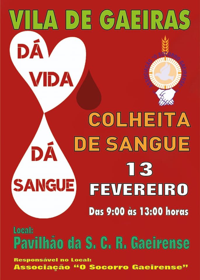 Durante o mês de Fevereiro, no concelho de Óbidos, há colheitas de sangue. Assim, no dia 3, será nas instalações dos Bombeiros de Óbidos e no dia 13, em Gaeiras.