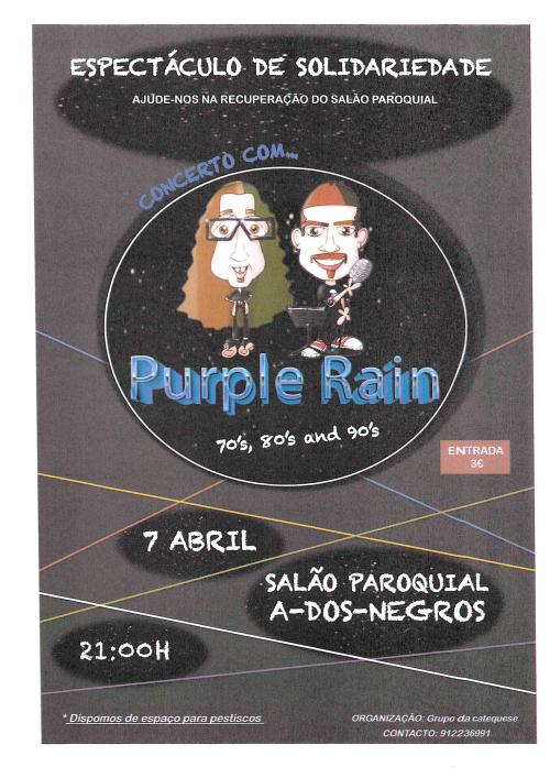 No próximo dia 7 de Abril, com início às 21h00, decorre em A-dos Negros, o concerto “Purple Rain”, no Salão Paroquial desta localidade do concelho de Óbidos. Trata-se de uma iniciativa de carácter solidário para obras de melhoramentos do respetivo salão.