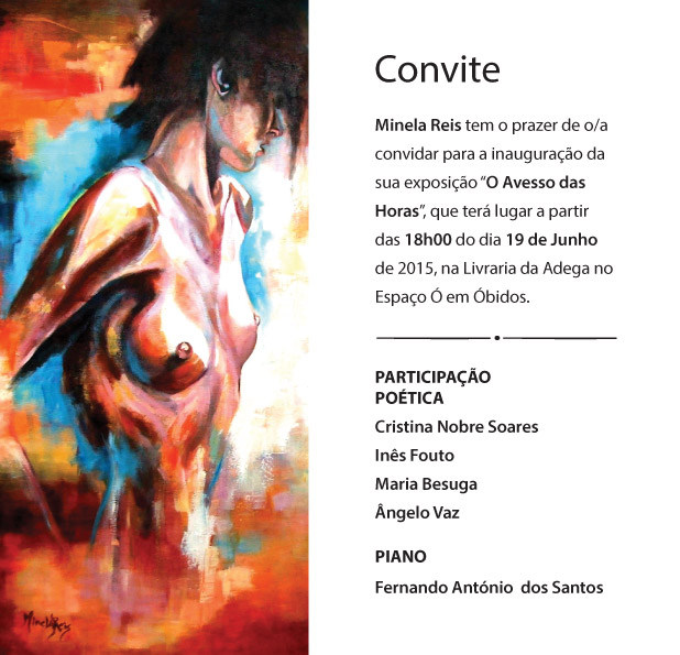 Inaugura hoje, 19 de junho, a exposição de pintura de Minela Reis, com o nome “O Avesso das Horas”. A mostra abre a partir das 18 horas , na Livraria da Adega, no Espaço Ó, em Óbidos.