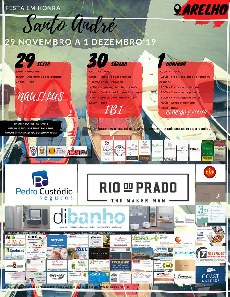 Decorre, na localidade do Arelho, Óbidos, nos dias 29 e 30 de Novembro e 1 de Dezembro, a festa em Honra de Santo André. Este ano, pela primeira vez, a comissão organizadora é composta apenas por mulheres.