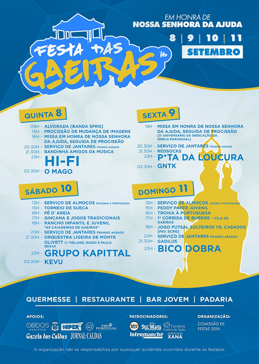 Todos os dias haverá quermesse, bar, restaurante e padaria. Apoio do Município de Óbidos, Óbidos Criativa, E.M., Junta de Freguesia de Gaeiras, entre outros.