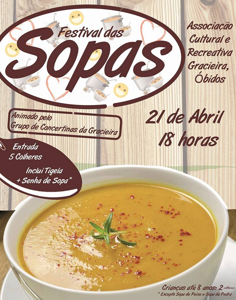 Irá realizar-se no próximo dia 21 de Abril, sábado, a partir das 18 horas, o 1º Festival de Sopas da Gracieira, na Associação Cultural e Recreativa da Gracieira (ASCURED), Óbidos.