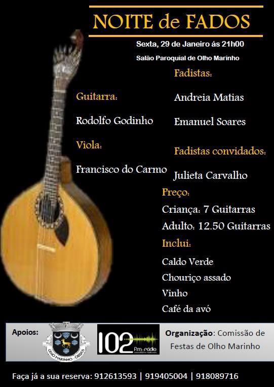 Decorre no Olho Marinho, localidade do concelho de Óbidos, uma Noite de Fados, no próximo dia 29 de janeiro, com início às 21 horas. O espetáculo terá lugar no Salão Paroquial do Olho Marinho.