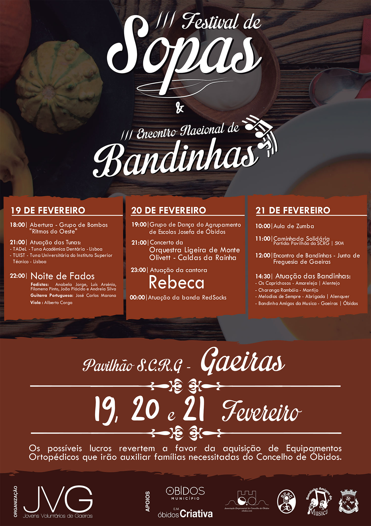 Nos próximos dias 19, 20 e 21 de fevereiro de 2016, a Associação de Jovens Voluntários de Gaeiras realiza o III Festival de Sopas e o III Encontro Nacional de Bandinhas, na vila de Gaeiras, concelho de Óbidos.