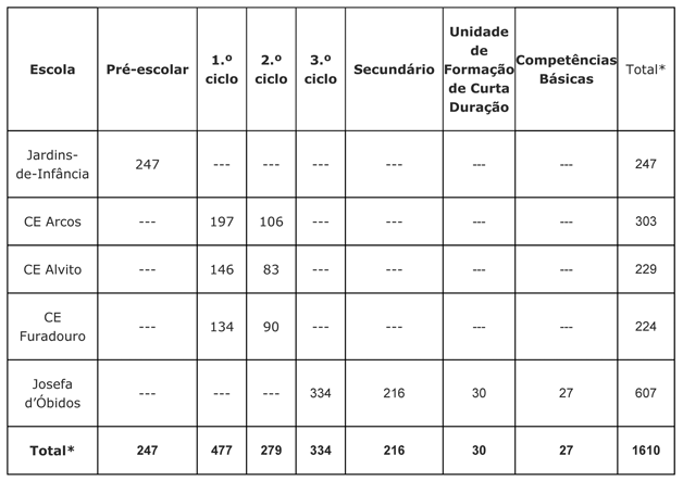 Em relação aos Complexos Escolares de Óbidos (1.º e 2.º ciclos), os Arcos têm 9 salas do 1º Ciclo e 4 salas do 2º Ciclo; Alvito com 6 salas do 1º Ciclo e 4 salas de 2ª Ciclo; e Furadouro com 6 Salas do 1º Ciclo e 4 salas de 2ºCiclo.