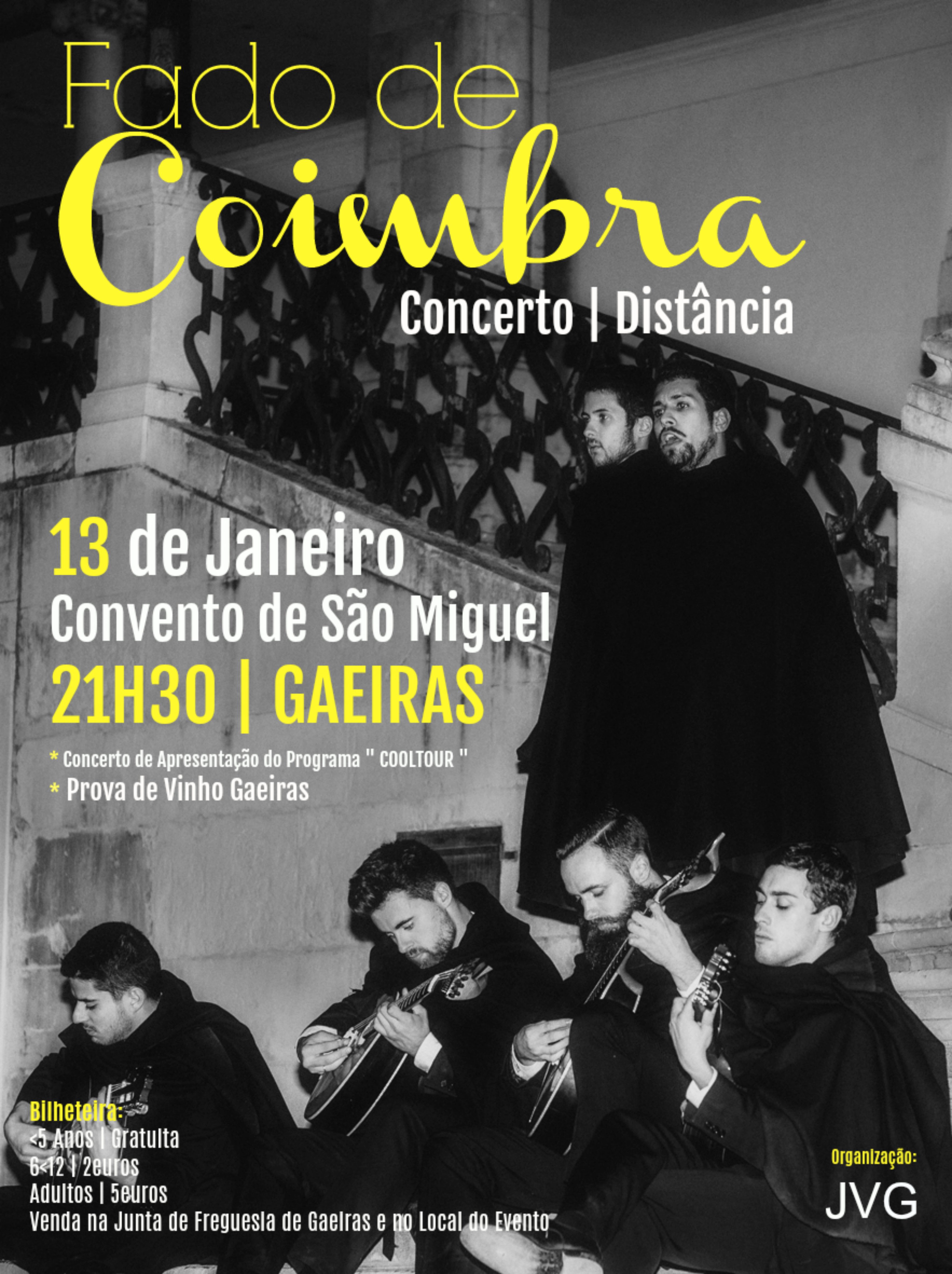 A Associação de Jovens Voluntários de Gaeiras (JVG) está a desenvolver um novo projeto de divulgação e ativação cultural, designado de “Cooltour”. A apresentação do projeto irá acontecer no dia 13 de Janeiro, pelas 21h30, no Convento de São Miguel, em Gaeiras. Haverá um concerto de Fado de Coimbra pelo grupo “Distância”.