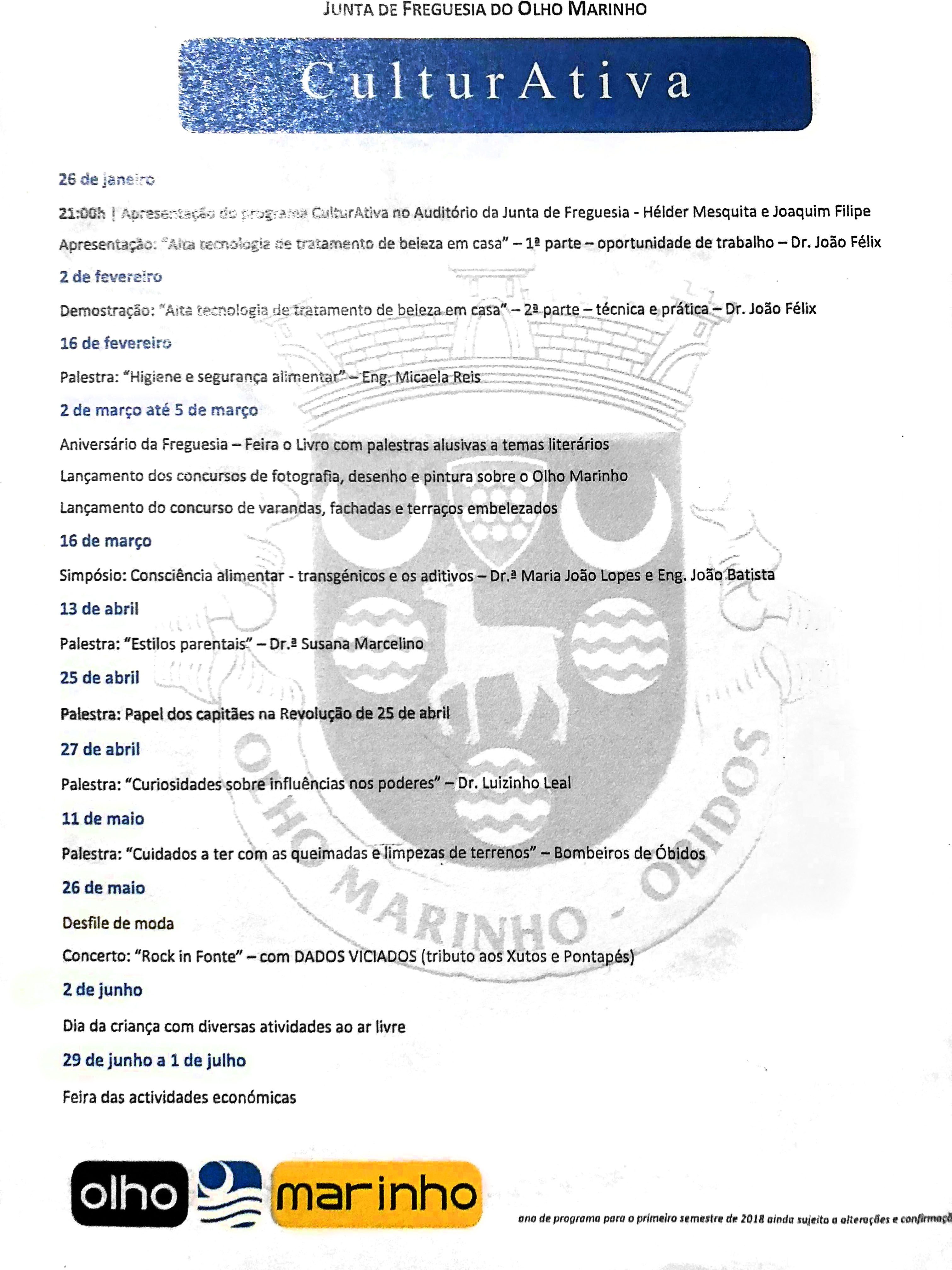A Junta de Freguesia de Olho Marinho apresentou, no passado dia 26 de Janeiro, o projeto CulturAtiva. Trata-se de uma agenda cultural, com a programação para o primeiro semestre de 2018. A sessão contou com a presença da vereadora Margarida Reis.