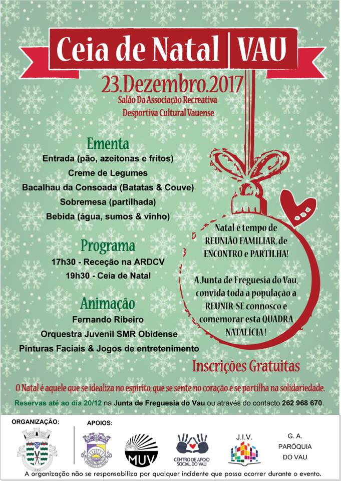 Realiza-se no próximo sábado, dia 23 de Dezembro, a festa de Natal da Junta de Freguesia do Vau, Óbidos. Este convívio terá lugar no salão da Associação Recreativa Desportiva e Cultural Vauense (ARDCV) e conta com muita animação e uma Ceia natalícia.