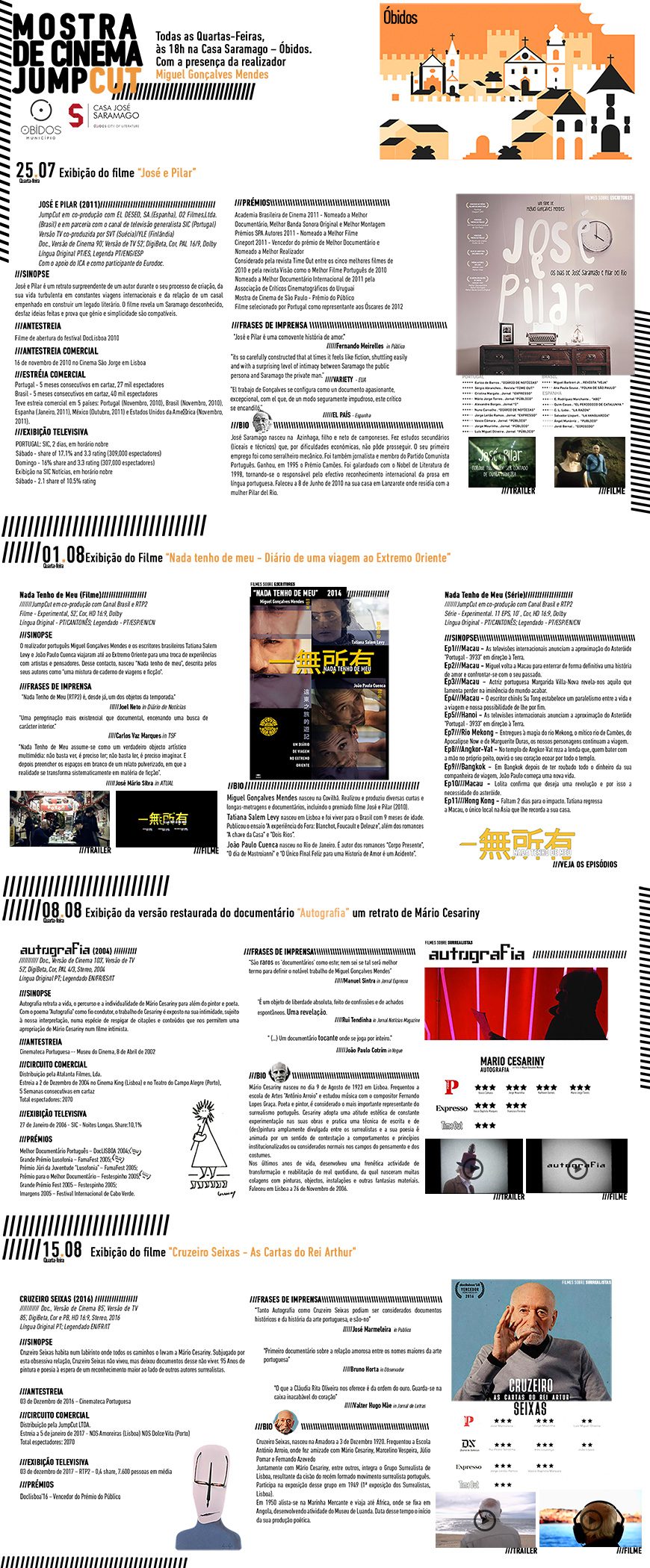 A Casa José Saramago, em Óbidos, recebe, em Julho e Agosto, uma mostra de Cinema. Será todas as quartas-feiras, pelas 18h00 e as sessões contarão com a presença do realizador Miguel Gonçalves Mendes.