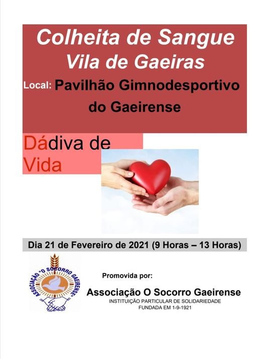 A Associação “O Socorro Gaeirense”, da localidade das Gaeiras, Óbidos, realiza, no próximo dia 21 de Fevereiro, entre as 09h00 e as 13h00, uma colheita de sangue.