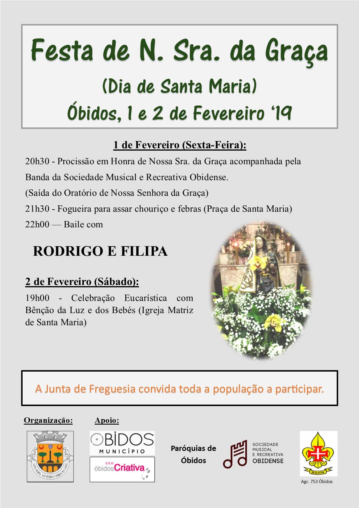 Tal como é tradição, nos próximos dias 1 e 2 de Fevereiro de 2019, realiza-se, na Praça de Santa Maria, em Óbidos, a Festa em Honra de Nossa Senhora da Graça.