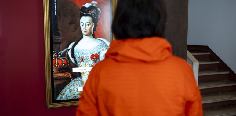 A experiência começa na entrada do espaço museológico, na Sala D. Maria I, onde o retrato de finais do século XVIII da Rainha, uma pintura a óleo sobre tela, “ganha vida”, para dar início ao percurso do visitante.