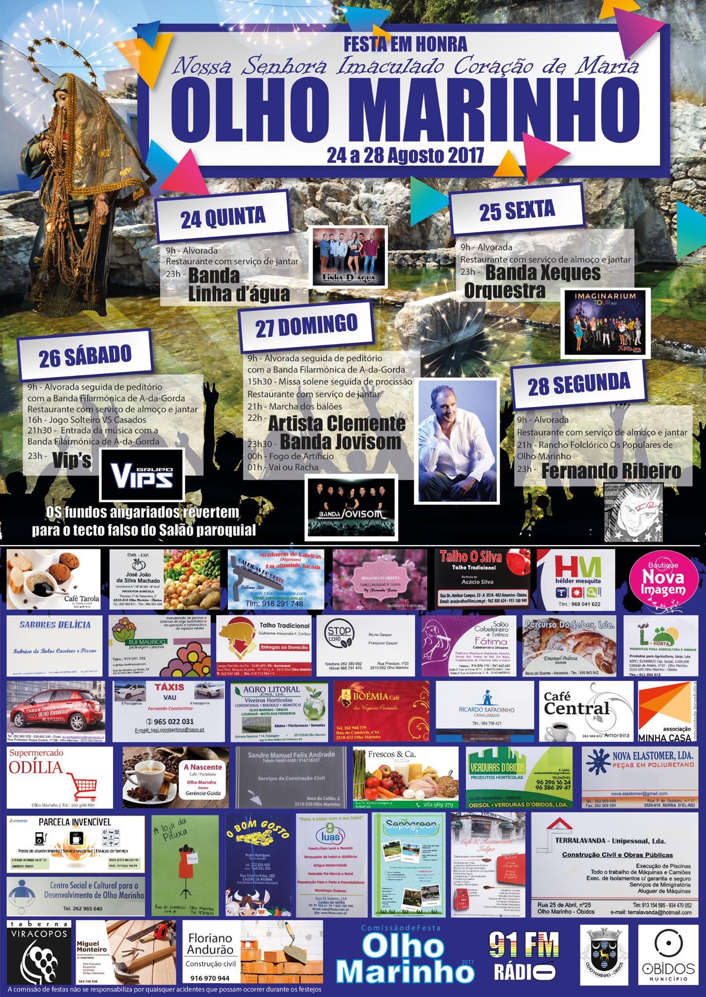 A festa na localidade de Olho Marinho, em Honra do Imaculado Coração de Maria, decorre de 24 a 28 de Agosto de 2017. O artista Clemente atua, este ano, na festa desta localidade do concelho de Óbidos.