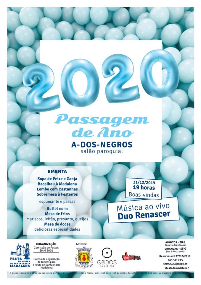 Estão abertas as inscrições para a Passagem de Ano em A-dos-Negros, no concelho de Óbidos. A organização é da Comissão de Festas de Santa Maria Madalena 2020 e realiza-se no Salão Paroquial da localidade, junto à Igreja de Santa Maria Madalena.