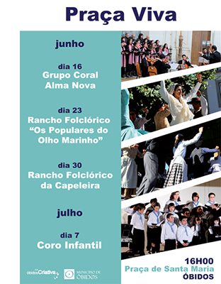 No âmbito da parceria que tem sido estabelecida, nos últimos anos, entre o Município de Óbidos e os diversos grupos e associações do concelho, durante o mês de junho e julho, aos domingos, os turistas terão animação na Praça de Santa Maria, em Óbidos. Trata-se do projeto Praça Viva.