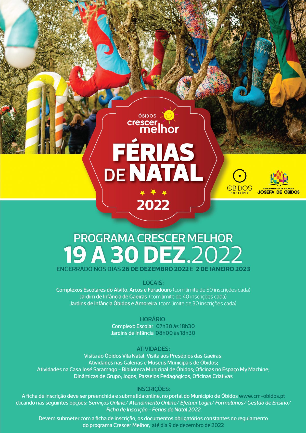 Estão abertas as inscrições para o programa Crescer Melhor – Férias de Natal 2022, que irá decorrer entre os dias 19 e 30 de Dezembro (encerrado no dia 26), para os alunos do pré-escolar, 1º e 2º ciclos do ensino básico.