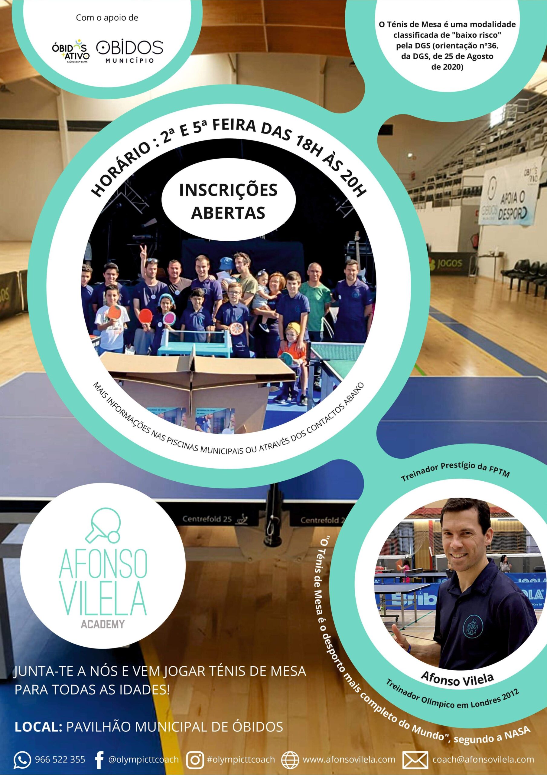 A Afonso Vilela Academy, Academia de Ténis de Mesa, presidida e coordenada pelo treinador Olímpico e treinador Prestígio da FPTM, vai ter a responsabilidade de desenvolver a modalidade de confrontação direta mais jogada em todo o mundo, no concelho de Óbidos. Um desporto que oferece diversos benefícios para a saúde física e mental, tem um carácter bastante inclusivo e pode ser usado na prevenção e tratamento de doenças como a demência, alzheimer e parkinson.