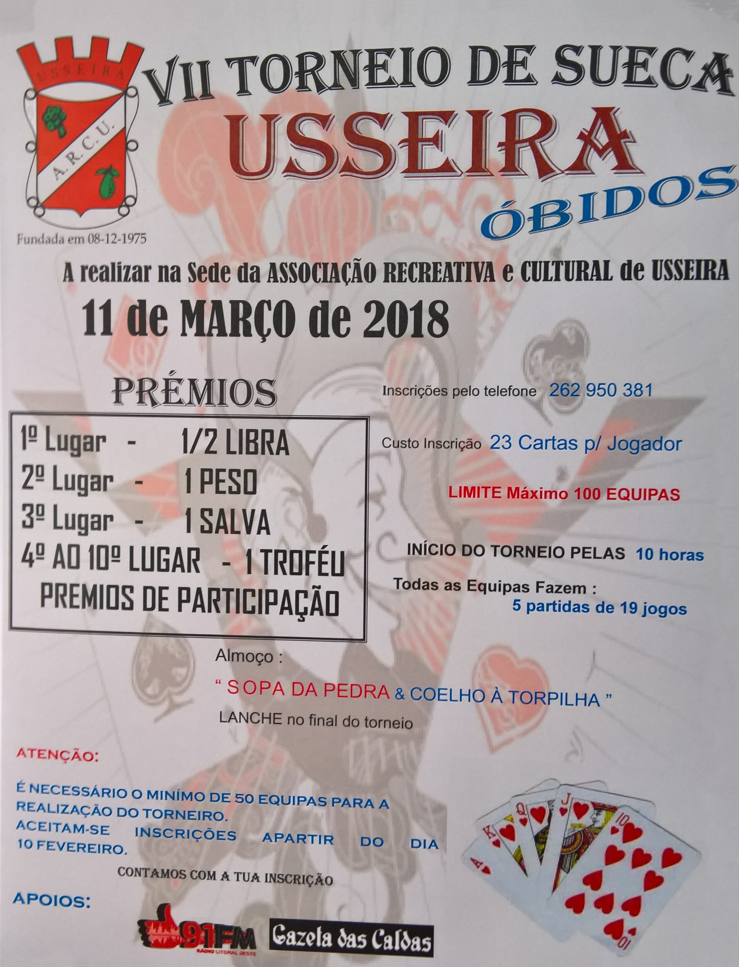 Na localidade de Usseira, Óbidos, vai decorrer no próximo dia 11 de Março, o 7º Torneio de Sueca da Associação Recreativa e Cultural da Usseira (ARCU), com os participantes a disputaram o mais popular jogo de cartas do mundo.