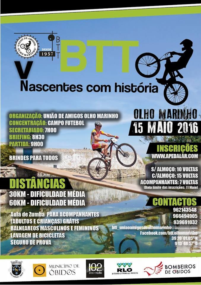 A V edição do BTT “Nascentes com História”, na localidade de Olho Marinho, Óbidos, já tem data oficial. Realiza-se no dia 15 de maio de 2016. No entanto, as inscrições já estão abertas.